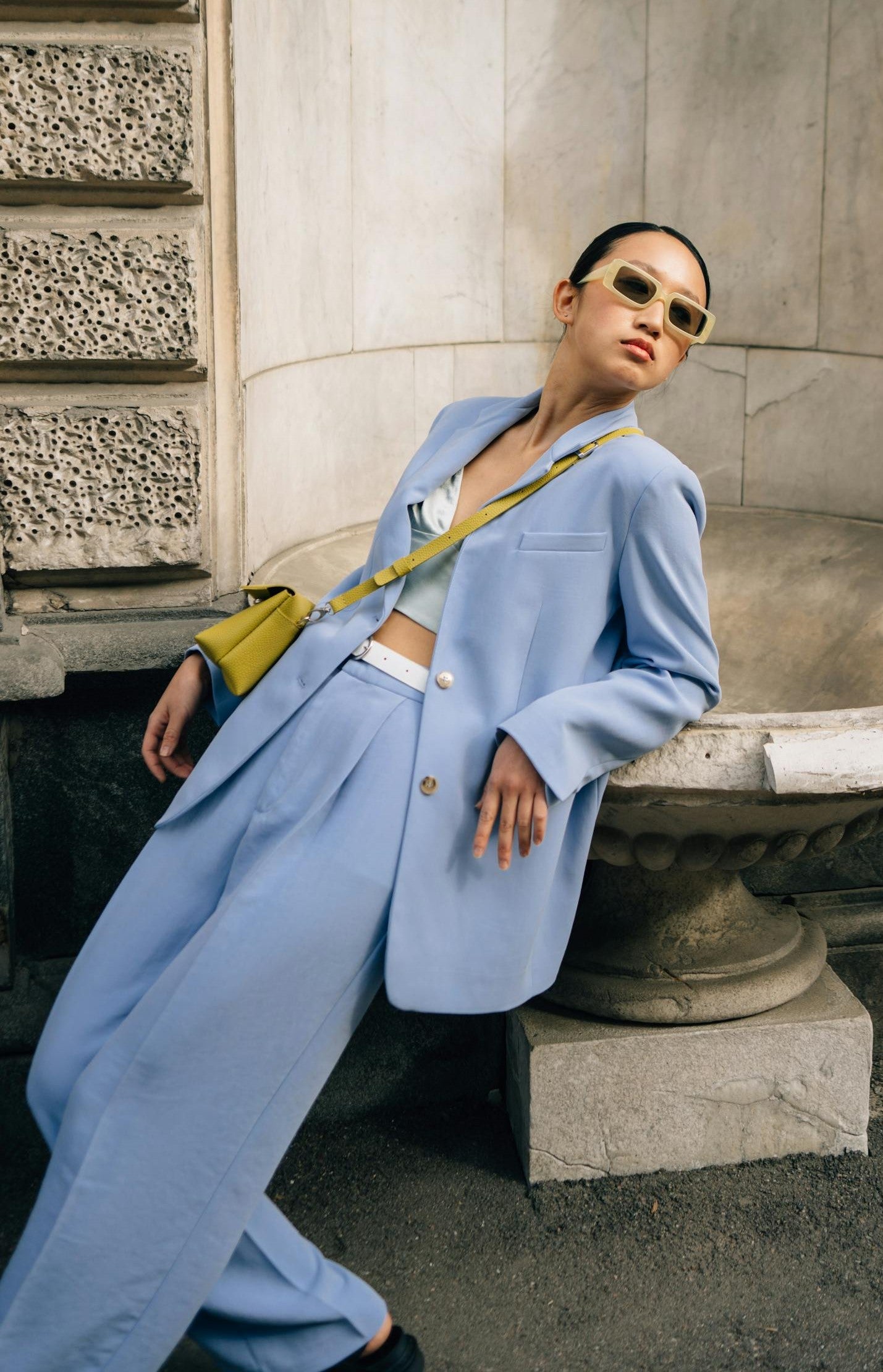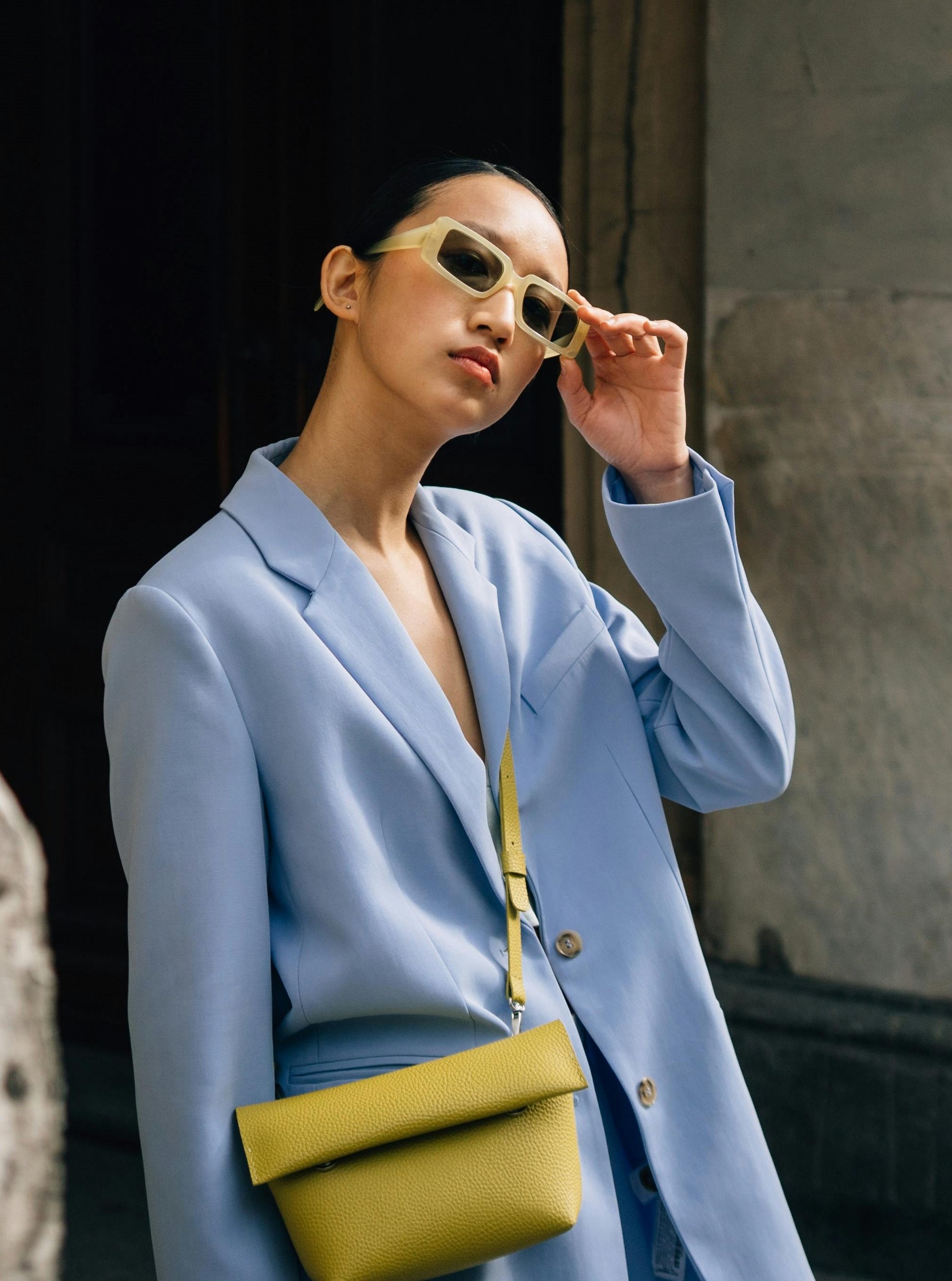 The silver color blouse and yellow purse shown in the image is not included.